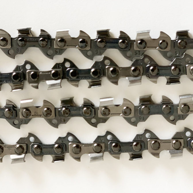 最もポピュラーな91チェーンのカッター数を2倍にしたFタイプ。カッターが2倍あることで切れ味が持続し、硬い木の切断が容易になりました。竹切り用として使われることも多く、その切断能力には定評があります。現在お使いのチェンソーのチェーンが91タイプであれば、ガイドバーやドライブスプロケットを交換せずにご使用いただけます。